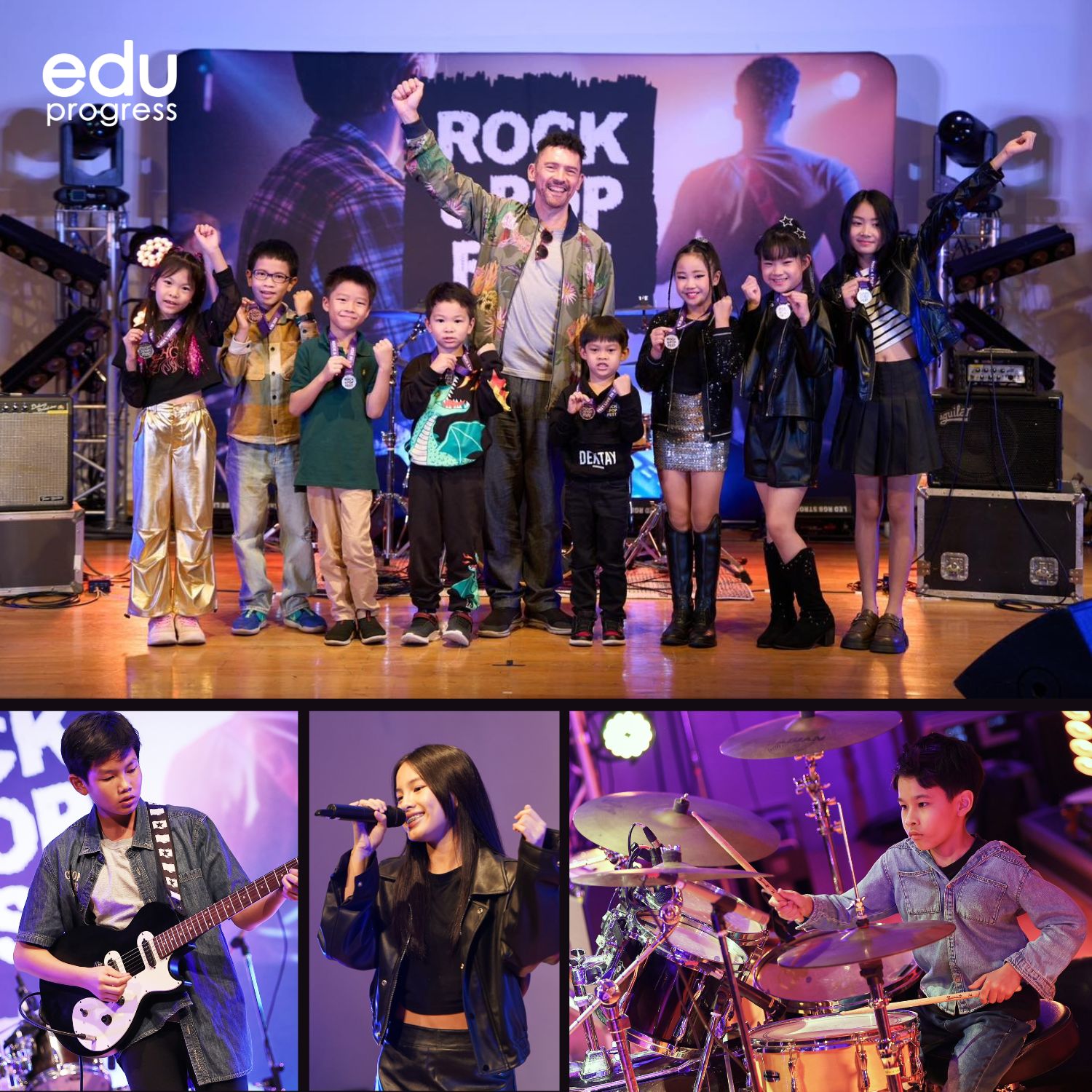 Rock & Pop Fest is an annual music festival organized by Eduprogress, with support from Trinity College London. This exciting event invites young solo musicians to showcase their talents in electric guitar, electric bass, drums, keyboard, or vocals.